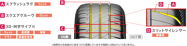 周方向のブロック配列を最適化することでパタンノイズを抑制。スポーティーな走りを損なうことなく、ハイパフォーマンスカーにふさわしいコンフォート性能を確保。