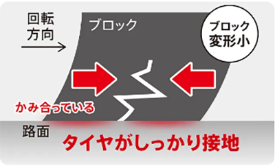 ブロック形状やサイプにより、タイヤ接地面への水の侵入を抑制し、しっかり接地。